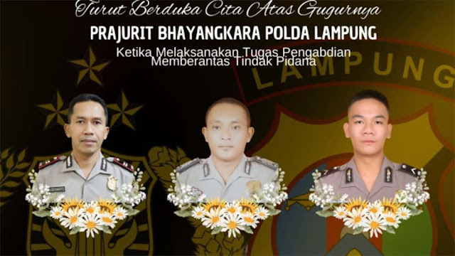 Kapolri Pak Jendral Sigit yang baik dan hebat. Kejajdian yang menimpa tiga anggota Polsek Nagara Batin, Polres Way Kanan, Polda Lampung ini bikin semua anggota Polri dari sabang sampai Merauke resah dan sedih. Khawatirnya anggota polisi menjad takut untuk bertindak menghadapi gangguan keamanan dan penyakit masyarakat. Khawatir kalau bakal terulang anggota Polda kembali.